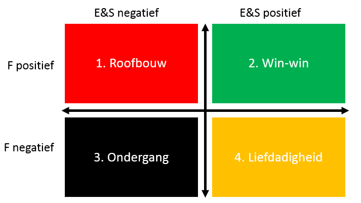 • Het investeerdersdilemma. Investeer je in een ‘traditioneel’ bedrijf met een grote uitdaging in de transitie? Voordeel: deze bedrijven kunnen meestal financieel tegen een stootje en zijn dus in staat om F (deels) uit te ruilen voor een positieve E en S. Hiermee kun je veel impact maken. Nadeel: ze hebben vaak meer tijd nodig en zijn niet altijd intrinsiek gemotiveerd.